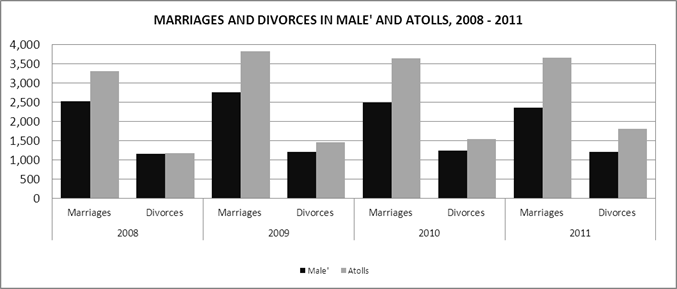 AND DIVORCES IN MALE' AND ATOLLS, 2008 - 2011 |